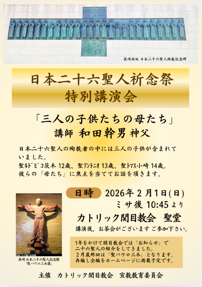 ※二十六聖人のお祈りを致します、ロザリオをご持参下さい。